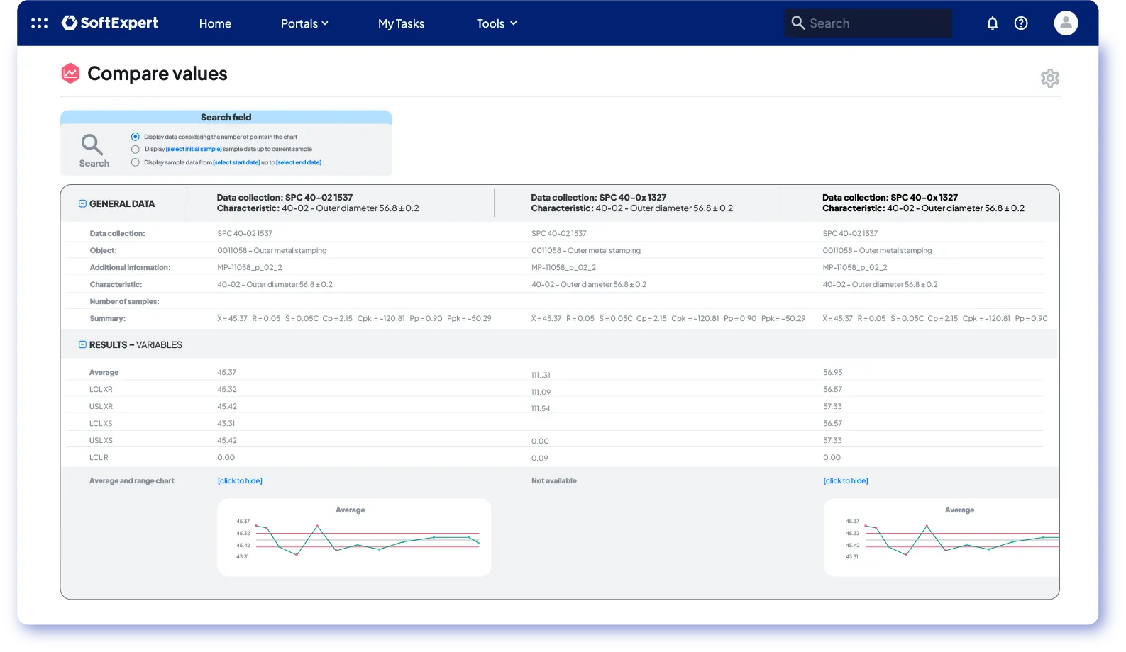 Utilizza una varietà di grafici di controllo che possono essere aggiornati in tempo reale, come istogrammi, grafici della media, grafici dell'intervallo, grafici della deviazione standard e bande di valutazione, tra gli altri.